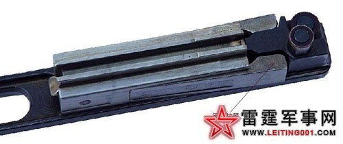 ▲呈开锁状态的枪机,闭锁片尾部合拢,枪机位于枪机框定型槽前方位置